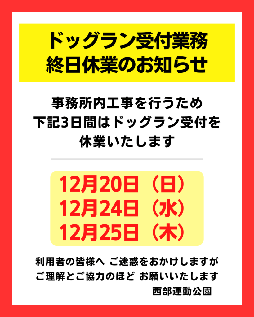 《ドッグラン受付業務 休業のお知らせ》